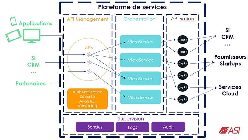 Cette couche, appelée API management, est une brique centrale de la plateforme. Au-delà de sa fonction de normalisation, elle se voit attribuée plusieurs autres rôles. Elle a ainsi pour tâche d’anonymiser les flux d’information qui traverse la plateforme pour garantir la confidentialité des échanges entre le client et le service. Elle peut aussi être le point de collecte des indicateurs d’usage de la plateforme et permettre ainsi sa monétisation. Elle joue également un rôle clé dans la sécurisation du dispositif.