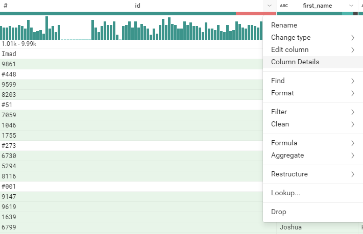 A droite, le volet permet de voir la recette. En bas, un builder contient l’ensemble des fonctions de transformations. Pour chaque colonne, une barre de Data Quality est présente, avec trois couleurs : verte (valeurs valides), rouge (valeurs invalides) et noire (valeurs nulles). En cliquant sur chaque tranche, il est possible d’accéder aux actions pouvant être appliquées à cette masse de données. Dans notre cas, nous allons accéder à la première colonne, et voir les détails de la colonne.