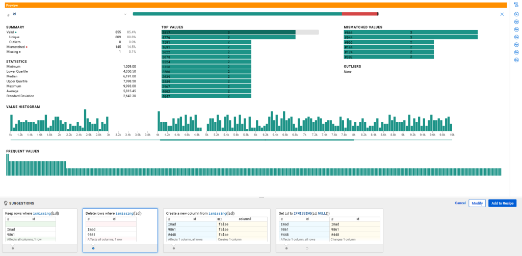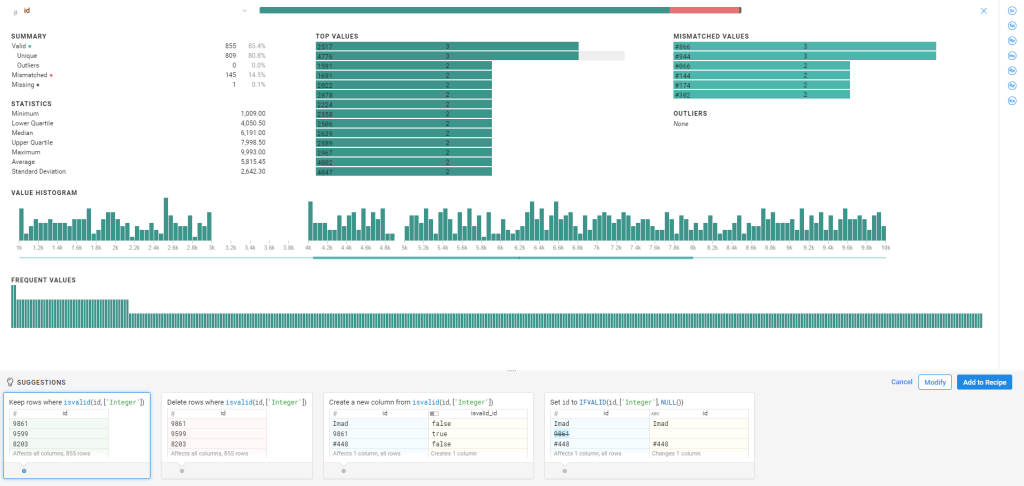 - Cliquer sur la partie noire de la barre de Data Quality, Trifacta suggère un ensemble d’actions
