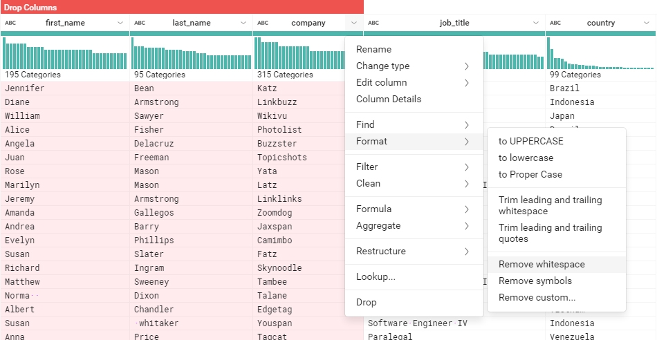 - Cherche la fonction Remove whitespaces() qui se trouve dans le menu ‘Format’, et l’appliquer pour toutes les colonnes