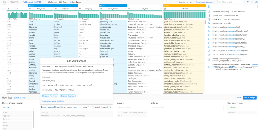 Comme Trifacta propose de faire nos propres formules, nous allons sélectionner les trois colonnes concernées, puis nous allons appliquer la fonction Merge() sur les trois colonnes avec un tiret entre le firstname et lastname et un @ entre la colonne résultante et le domaine_compagny. La figure suivante montre comment nous avons pu combiner plusieurs fonctions pour construire une formule. Dans notre exemple, nous avons fait plusieurs étapes en une seule grâce à la formule suivante : MERGE ([MERGE([Lower(first_name),Lower(last_name)], ‘-’),email_domain], ’@’).