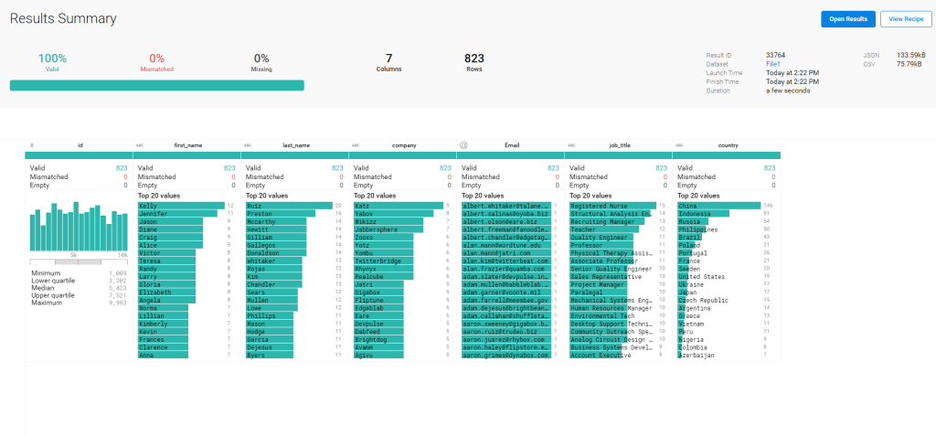 Une fois le DATASET ajouté, Trifacta propose un premier tableau de bord :