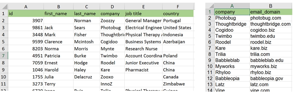 - le second (DOMAINE_COMPAGNIE) contient 2 colonnes (nom et mail de l’entreprise). La jointure avec le premier se fera sur le champ ‘company’.