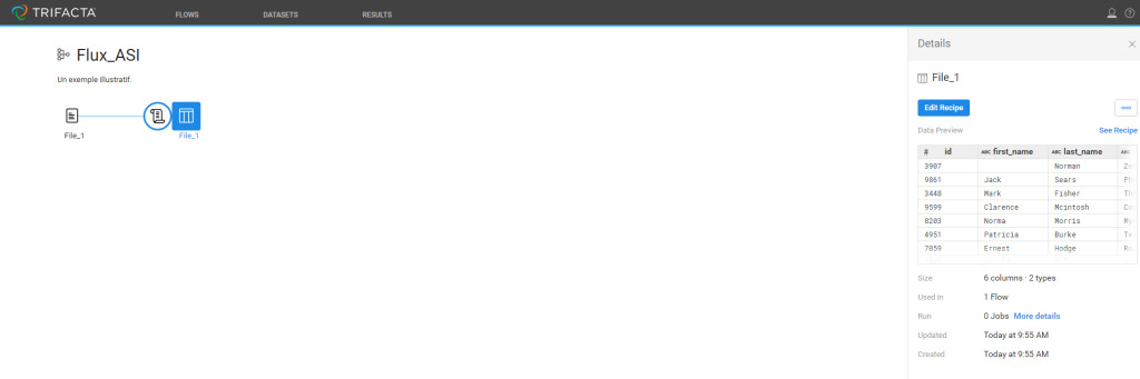 Il permet de voir la constitution du flux (dans le volet à droite, nous pouvons voir un premier aperçu des données ainsi que les premières étapes de la recette).