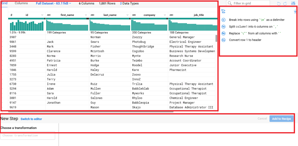 - Cliquer sur ‘Add to Recipe’. Il est également possible de cliquer sur ‘Modify’ pour avoir une transformation plus adaptée. La force de Trifacta est de pouvoir ajouter des expressions régulières et combiner plusieurs fonctions.