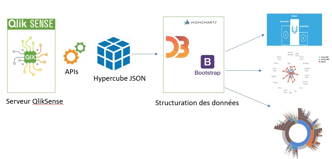 Le serveur Qlik Sense nous propose un certain nombre d’APIs. Ces interfaces permettent une interaction avec notre serveur, ce qui permet d’extraire des données ainsi que diverses informations. Ces données et informations extraites peuvent être traitées avec du JavaScript afin de les structurer et de les visualiser selon notre besoin. En plus du JavaScript basique, des bibliothèques CSS (comme Bootstrap) et du HTML peuvent être utilisés afin de faire des Dataviz plus au moins personnalisées.