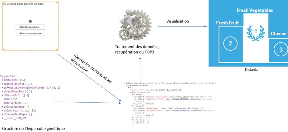 La structuration et l’accès aux données retournées depuis le serveur seront contenus dans la méthode Paint ($element, layout). Cette dernière est rafraîchie à chaque fois que les propriétés changent ou que le widget est redimensionné. Le serveur Qlik Sense retourne des données sous format d’un hypercube JSON. L’accès à cet hypercube se fera par la fonctionnalité layout.qHypercube. L’hypercube est un objet JavaScript générique, qui va contenir les données ainsi que des métas données sur ce que l’utilisateur de l’extension mettra comme mesure et dimension depuis l’interface Hub.